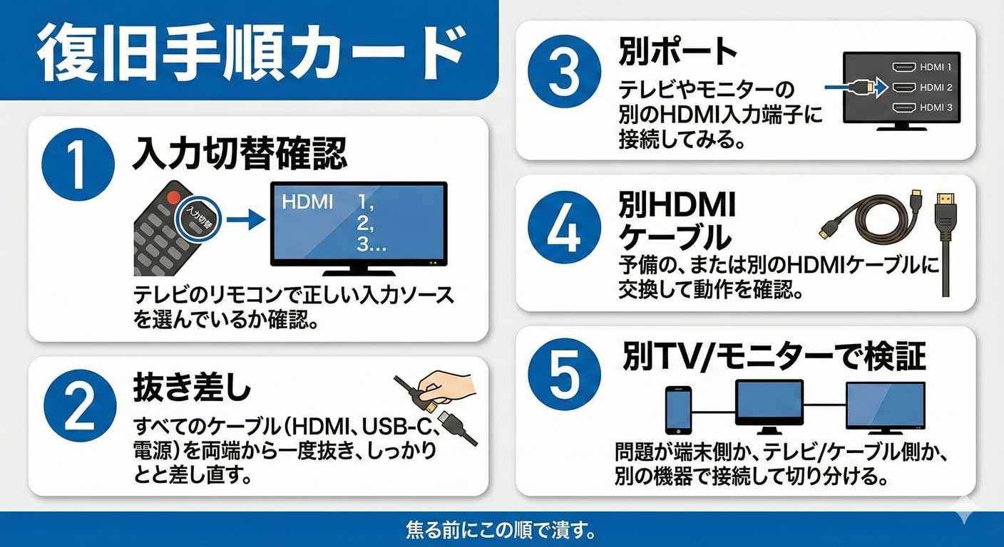 | 動画アプリだけ黒 | 別ポート → 別変換方式 → 別TV | HDCP要因の可能性 | 症状が固定ならHDCP系の切り分け記事へ。 |