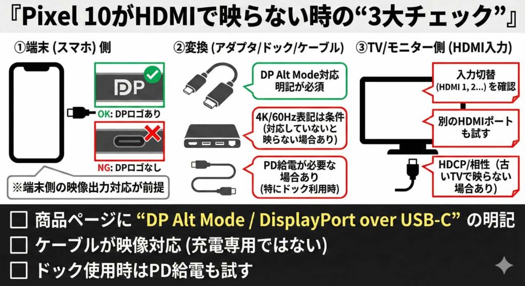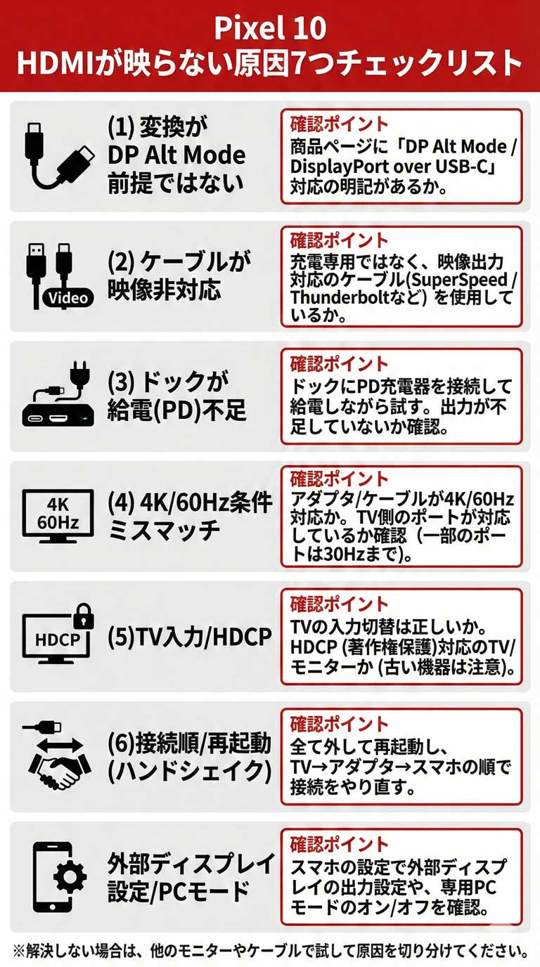 よくある原因7つ:Pixel 10がHDMIで映らないチェックリスト