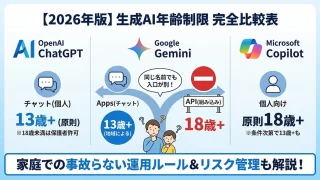 AIの事 【2026年版】生成AI年齢制限の完全比較表!GeminiのAPIが18禁なのは大人の事情でした お子様の生成AI利用、規約で迷っていませんか?2026年最新のChatGPT、Gemini、Copilotの年齢制限を完全比較。特にGeminiは「チャットは13歳~」「APIは18禁」と入口が違う大人の事情が…。一次ソースに基づく正しい知識と、家庭で事故らない運用ルールが分かります。 2026.01.02 メリ爺 AIの事